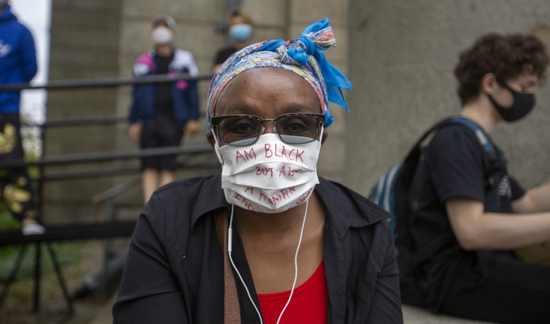 atherine Kagiri, of Quincy, wearing a facemask that says “Am black, but also human,” at a Quincy demonstration and vigil to protest the killing of black Americans at the hands of police on June 2, 2020. (Joe Difazio/The Patriot Ledger)